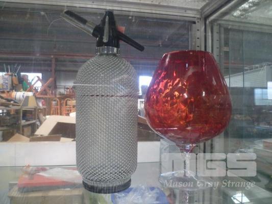 VINTAGE SODA SIPHON & RED GLASS VASE