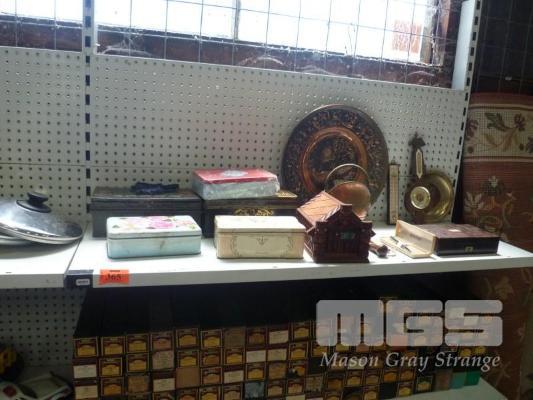 ASSORTED VINTAGE TINS, COPPER ART, BAROMETER & THERMOMETER, ETC