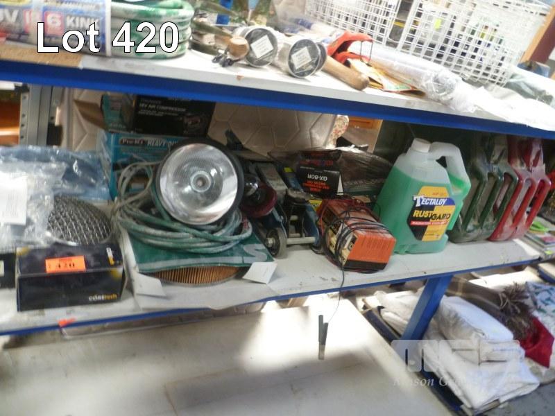 ASSORTED AUTOMOTIVE EQUIPMENT, SEAT COVERS, JERRY CANS, AIR FILTERS, JACK, TOW HITCH, ETC