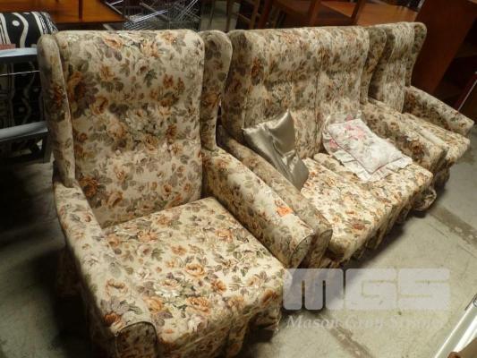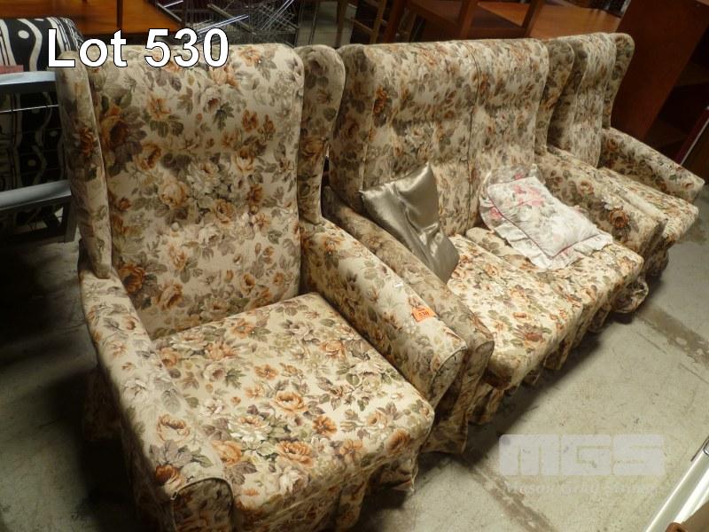 BROWN FLORAL FABRIC UPHOLSTERED 3 PIECE WING BACKED SOFA INCLUDING 2 SEATER SOFA & 2 x ARM CHAIRS