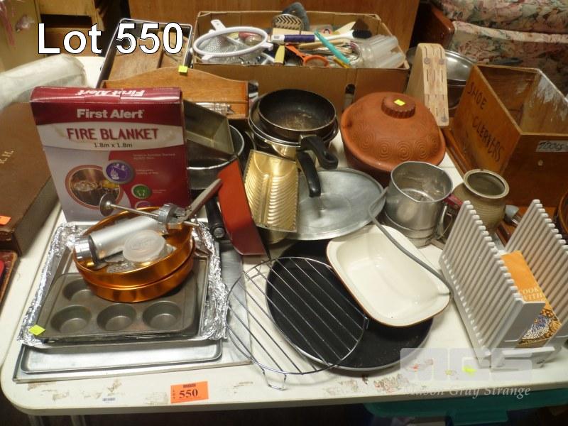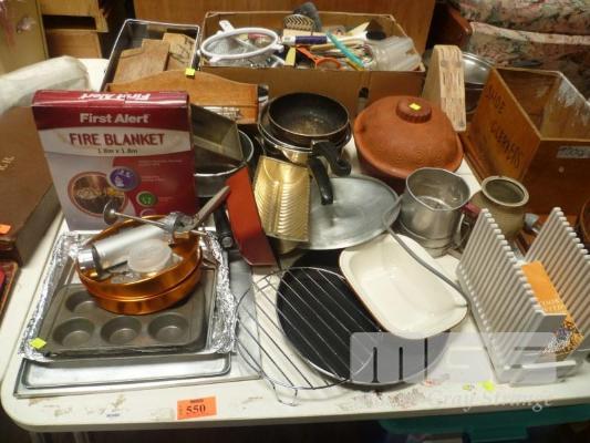 ASSORTED KITCHENWARE, BAKING TRAYS, CUTLERY, FRY PANS, ETC