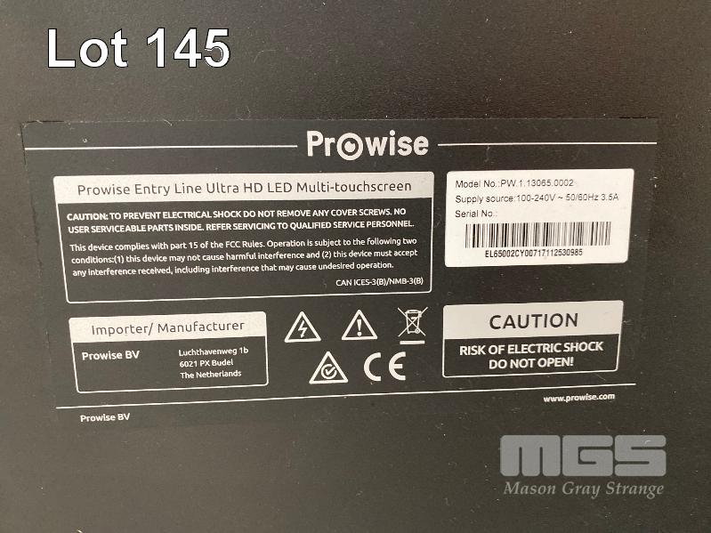 MONITOR, PROWISE ENTRY LINE 65" ULTRA HD LED MULTI-TOUCHSCREEN, 3840x2160, MODEL PW.1.13065.0002, REMOTE WITH BUILT-IN PC MODULE, CORE i5 6400 @ 2.7GHz, 4GB RAM, 128GB SSD, Wi-Fi, MODEL PW.2.17014.0001 WITH WALL BRACKET, KEYBOARD & MOUSE S/N:EL65002CY00717112530985