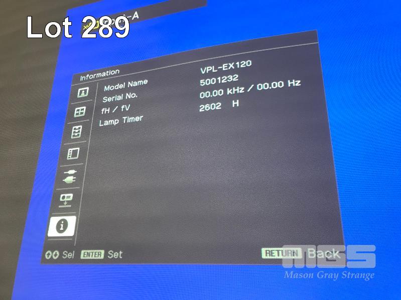 PROJECTOR, SONY VPL-EX120 3LCD, 2,600 LUMENS, 2,602 HOURS SHOWING (NO REMOTE) S/N:5001232