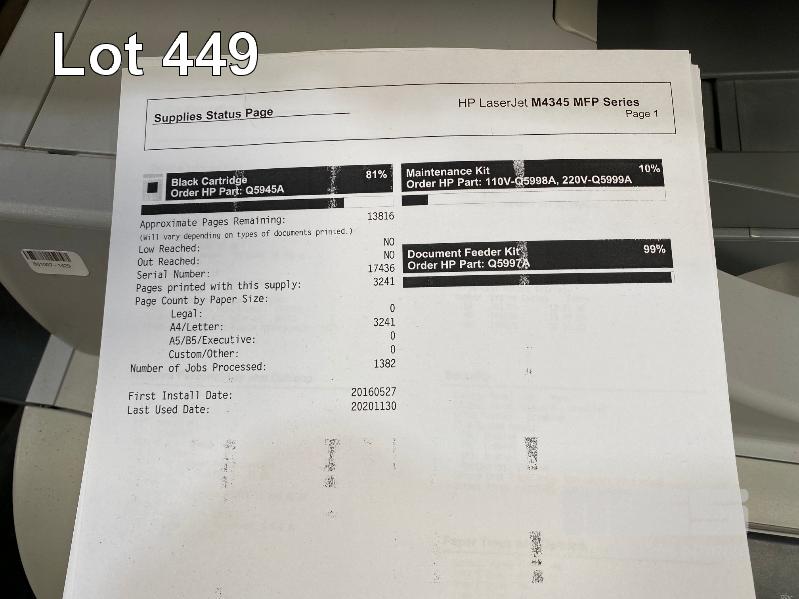 PRINTER, HP LASERJET M4345 MFP, ADF, USB, NETWORK, 203,150 PAGES (TEST PAGE ATTACHED - POOR QUALITY) S/N:CNCJ89S00C
