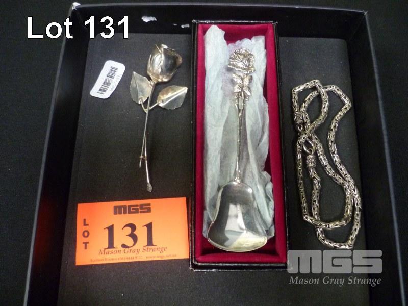 SILVER NECKLACE, ROSE BROOCH, MARKED 925 & SOLVER SPOON, MARKED 835