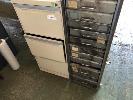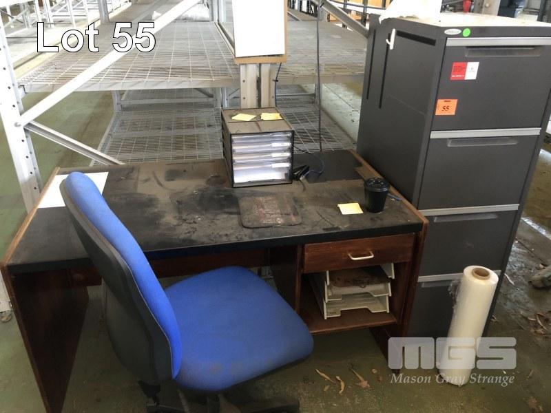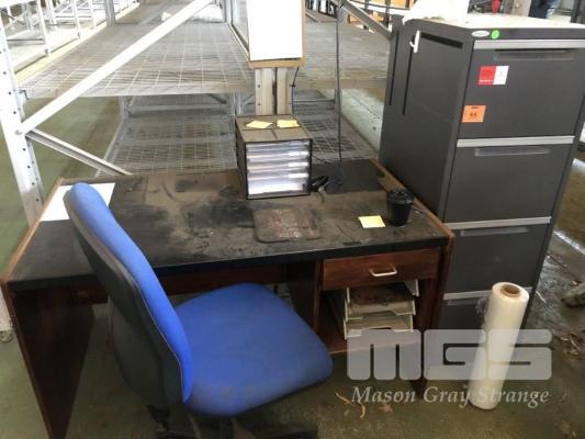 TIMBER OFFICE DESK, SINGLE DRAWER, VINYL TOP 1350 x 740mm WITH STEEL 3 & 4 DRAWER FILING CABINETS & TYPIST CHAIR , PLUS CARD FILE CABINET.