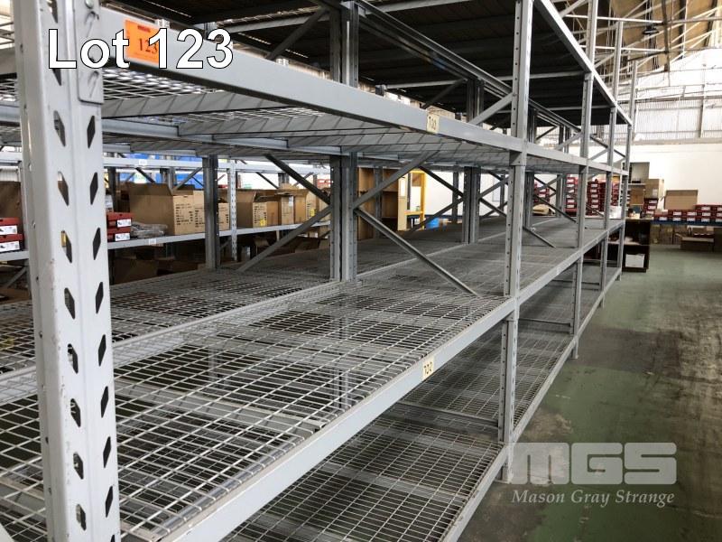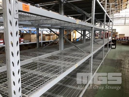 1 ROW COLBY PALLET & STORAGE RACKING, 4 BAYS 5 x , 3680mm UPRIGHTS 32 x CROSSBEAMS, 2600mm RACK: 1160mm (D) WITH 100 x 40mm MESH PANELS TO EACH SHELF PALLETS ON BOXES