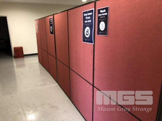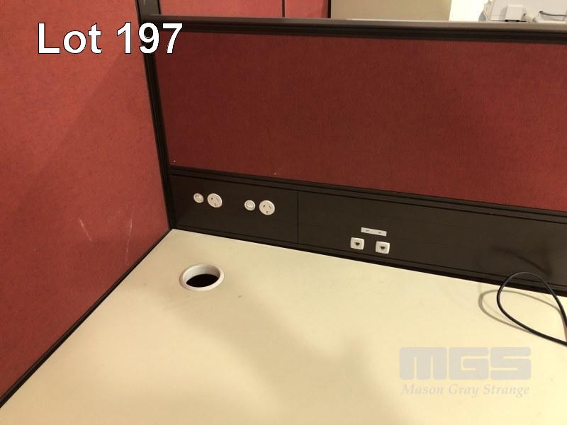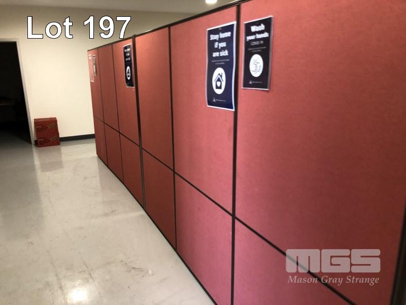 30 x OFFICE DIVISION PANELS ALLOY AND RED MATERIAL 12 PANELS 1800 x 900mm 6 PANELS 1200 x 1200mm 12 PANELS 1200 x 900mm WITH GPO's AND NETWORK PORTS BUYER TO DISCONNECT ELECTRICAL AND REMOVE