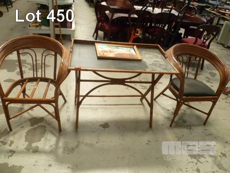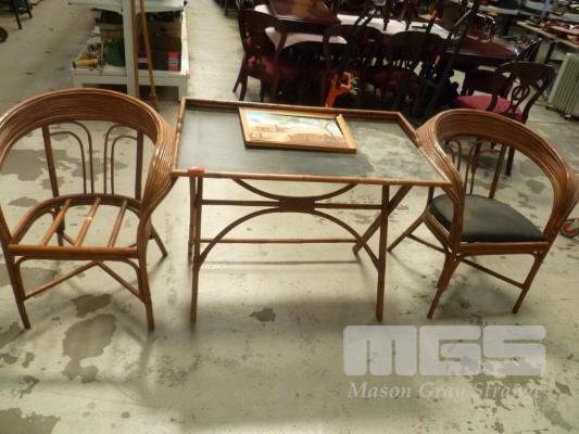 CANE 3 PIECE OUTDOOR SETTING, INC RECTANGULAR TABLE & PAIR ARM CHAIRS, (1 x CUSHION MISSING)