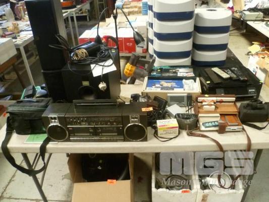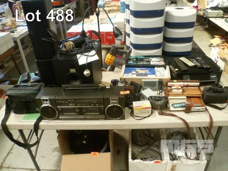 ASSORTED EARLY PHOTOGRAPHIC ITEMS, NATIONAL PORTABLE STEREO, SUBWOOFER, SPEAKERS, EPSON PRINTER, ETC, 1 x TABLE