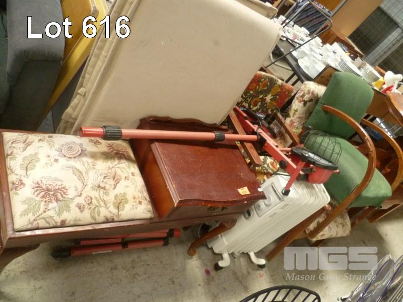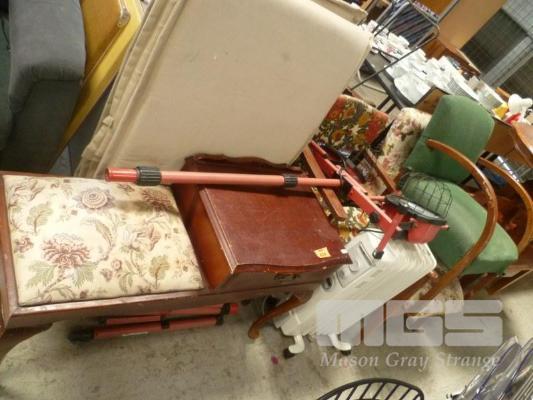 3 x TIMBER ARM CHAIRS, TELEPHONE TABLE, COLUMN HEATER, PAIR OF OUTDOOR LOUNGE CUSHIONS & WORKSHOP LIGHTS