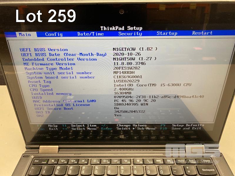 LAPTOP, LENOVO THINKPAD YOGA 260 (20FES1W202), CORE i5 6300U (6TH GEN) @ 2.4GHz, 16GB DDR4 RAM, 256GB M.2 SSD, 12.5" TOUCHSCREEN (1920x1080), INTEL HD VIDEO, Wi-Fi, BLUETOOTH, WINDOWS 10 PRO INSTALLED & POWER SUPPLY (NOTE: MARKS ON SCREEN) S/N:MP14RRDH