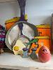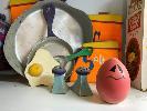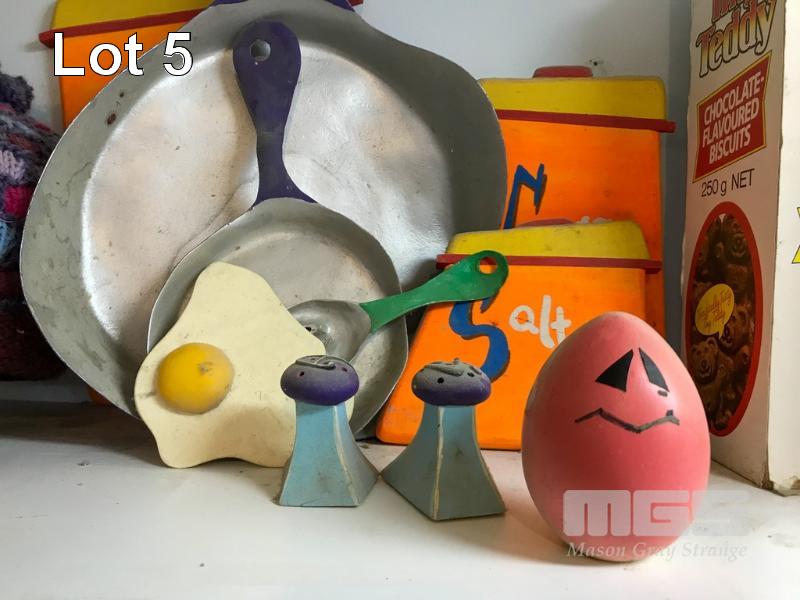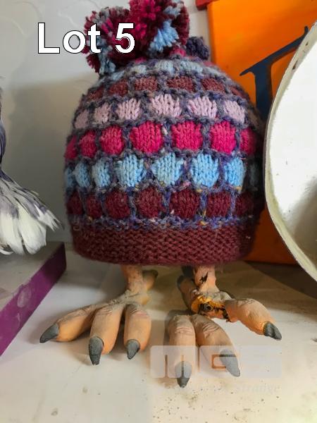 A MIXED BAG OF CHARACTERS. A CLAY AND FOAM LATEX VULTURE AND ANOTHER VULTURE HIDING UNDER A TEA COSY FROM A COTTEES JAM TV COMMERCIAL. ALSO INCLUDES A SET OF PROPS AND A CHARACTER FROM A "ME NO FRY" TV COMMERCIAL FOR SUNSCREEN. (NB: BONUS! THE WINNING BIDDER WILL RECEIVE A LINK TO THE COTTEES TV COMMERCIAL.)