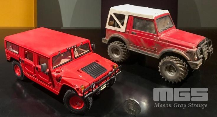 SET OF VEHICLES INCLUDING A HUMMER, A FOUR WHEEL DRIVE, AN EARTH MOVER AND A MOTOR BIKE