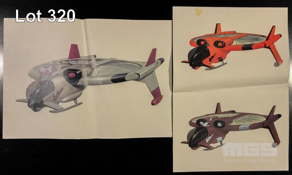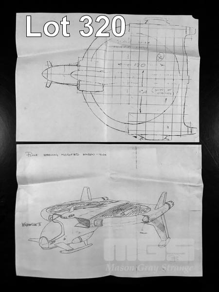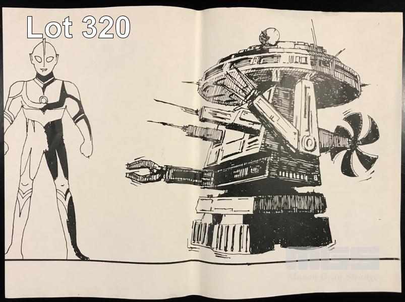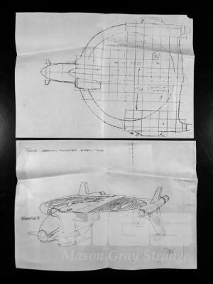 UNIQUE, VERY RARE ULTRAMAN MEMORABILIA. THE MACHINES. B&W AND COLOURED COPIES OF THE INITIAL VEHICLE AND AIRCRAFT DESIGNS. LOT ALSO INCLUDES COPY OF INITIAL UMA HQ SET DESIGN THAT WAS USED BY THE SET BUILDERS