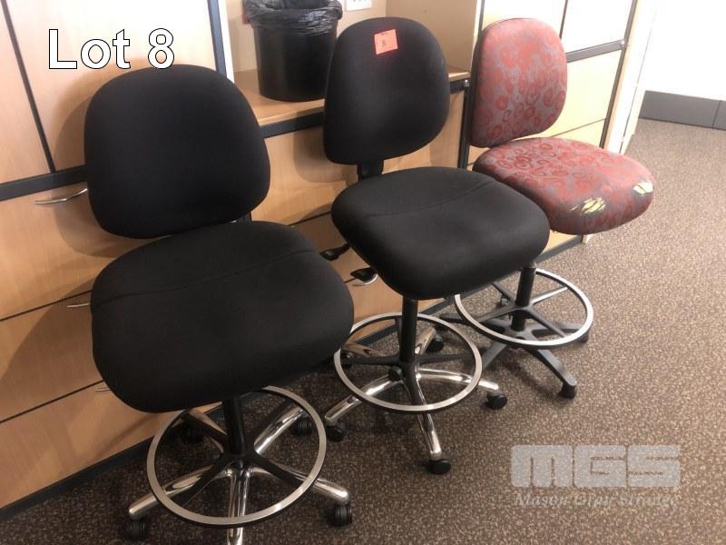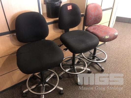 3 x DRAFTING CHAIRS, 2 x BLACK FABRIC, CHROME FEET & 1 x ORANGE FABRIC, (TORN)