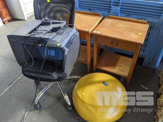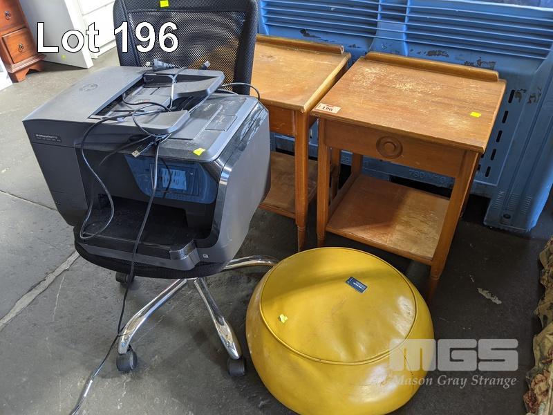 PAIR TIMBER BEDSIDE CABINETS, OFFICE CHAIR, MUSTARD POUFFE (WATER DAMAGE) & HP OFFICEJET PRO 8710