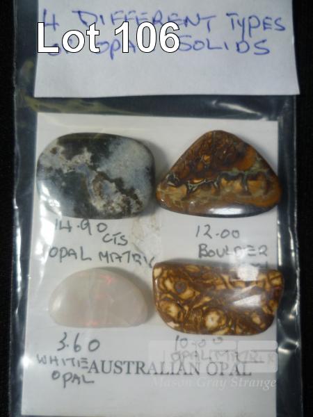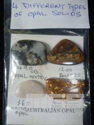 4 X ASSORTED SOLID OPALS, INC; MATRIX 14.9 CTS, BOULDER 12.0 CTS, WHITE 3.6 CTS, MATRIX 10.0 CTS
