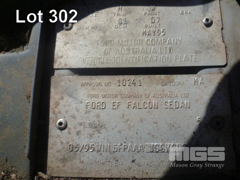 1995 FORD FAIRMONT EF SEDAN REG: VSP-954 (SA) VIN: 6FPAAAJGSWSL22635 ENG: JGSWSL22635 6 CYL 4 LITRE, 4 SPEED AUTOMATIC, PETROL, SILVER, 4 DOORS, 5 SEAT, AIR CON, ALLOY WHEELS, CD PLAYER, CENTRAL LOCKING, POWER STEERING, POWER WINDOWS, SPARE WHEEL, TOW BAR (NO PAPERS, NO KEYS, WITH OWNER'S MANUAL, NO SERVICE BOOKS) CONDITION: FRONT SEATS - WORN FADED BODY - PAINT FADED SOME SURFACE RUST ENGINE - NOT RUNNING PROBLEM UNKNOWN