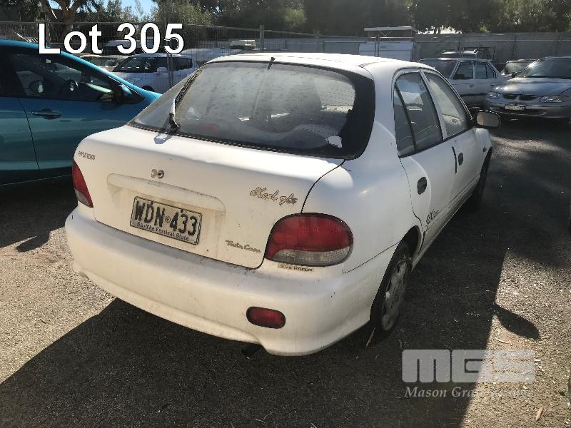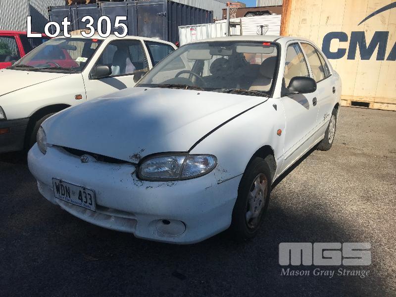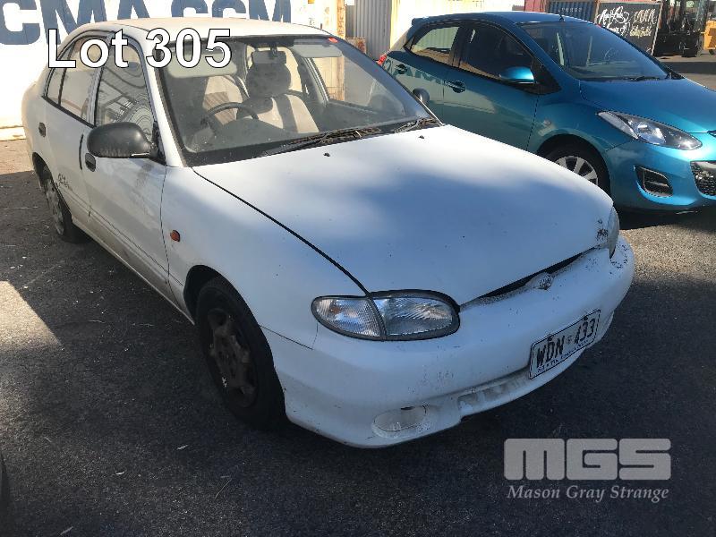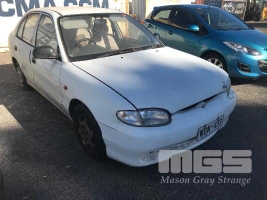 1998 HYUNDAI EXCEL GLX SEDAN REG: WDN-433 (SA) VIN: KMHUA31NPWU363446 ENG: G4FKWS32829 ODO: 199,659 KM 4 CYL, 5 SPEED MANUAL, PETROL, WHITE, 4 DOORS, 5 SEAT, AIR CON, CD PLAYER, POWER STEERING, SPARE WHEEL (NO PAPERS, NO OWNER'S MANUAL, NO SERVICE BOOKS) CONDITION: OVERALL - POOR CONDITION