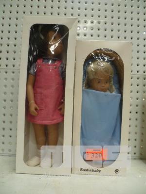 SASHA DOLL & SASHA BABY, 1 x SASHA BRUNETTE, RED PINAFORE, 1 x BABY NEST, FAIR HAIR No 111 & 513S, MADE IN ENGLAND, NEW IN BOX