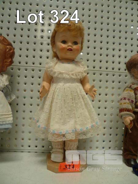 PEDIGREE CELLULOID BABY DOLL ON DISPLAY STAND WITH FLORAL & LACE DRESS & RED SHOES, SLEEPING EYES, MOVING LIMBS & BLONDE HAIR