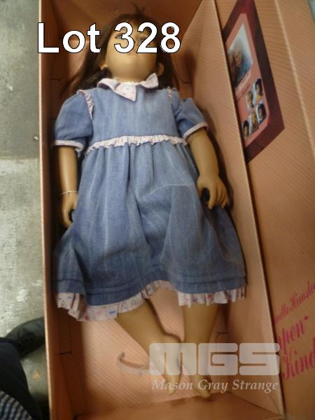 ANNETTE HIMSTEDT PUPPEN KINDER, YOUNG GIRL DRESS DOLL ON DISPLAY STAND, 2'6" (H), DENIM DRESS, NEW IN BOX