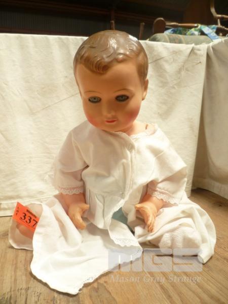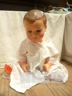 VINTAGE PLASTIC BABY DOLL, MARKED PCP FRANCE 50 IN LINEN DRESS & BOOTIES, SLEEP EYES & MOVING LIMBS