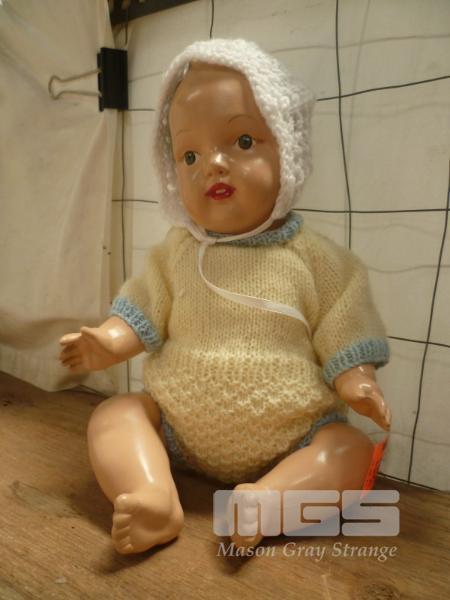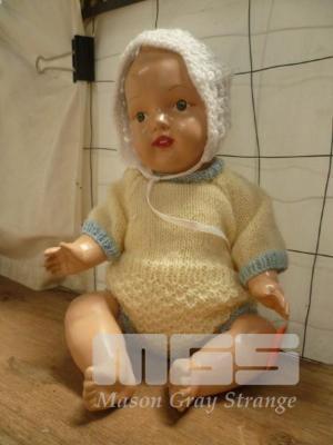 VINTAGE BABY DOLL, CELLULOID HEAD & BODY, SLEEP EYES, MOVING LIMBS IN KNITTED ENSEMBLE, JUMP SUIT & BONNET