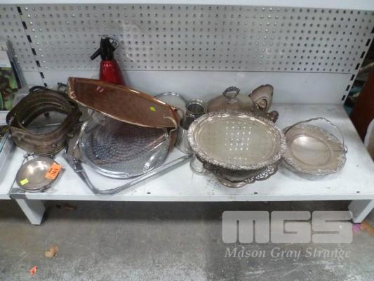 ASSORTED EPNS & PEWTER TANKARDS, SERVING PLATTERS, TRAYS, ETC