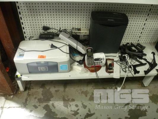 HP PRINTER, PAPER SHREDDER, LAMINATOR, PLATE STANDS, ETC