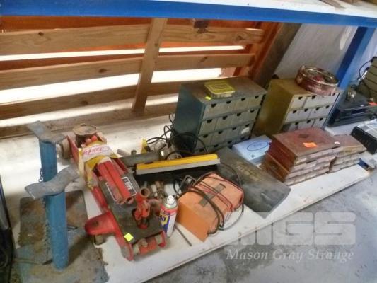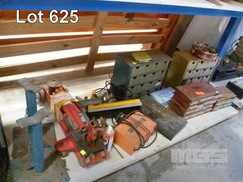 TROLLEY JACK, JACK STANDS, HAND TOOLS, PART TRAYS, FITTINGS, ETC