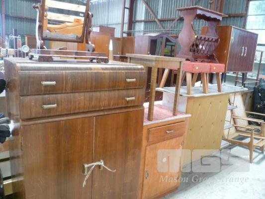 ASSORTED MID CENTURY FURNITURE INC FREESTANDING BAR, RECORD CABINET, PAIR FOOT STOOLS, MAGAZINE RACK, KITCHEN CUPBOARD, SIDE TABLE, VANITY MIRROR & WARDROBE