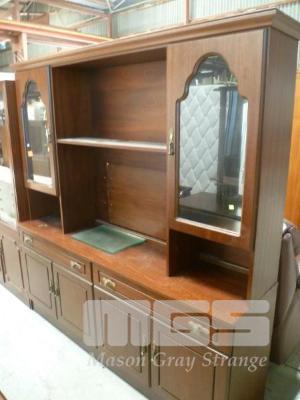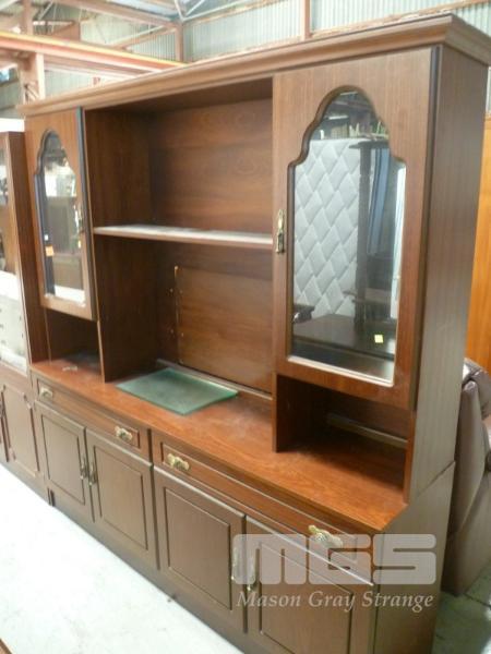 TIMBER VENEER WALL UNIT, 4 DOOR, 2 DRAWER, GLAZED DOORS, MIRROR BACK, (SIGN OF REPAIR IN CENTRE)