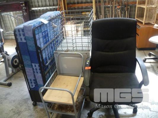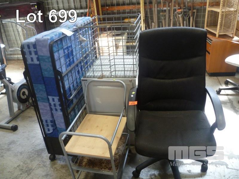 OFFICE CHAIR, EXECUTIVE CHAIR & GREY METAL 2 DRAWER FILING CABINET, WIRE CAGE, TROLLEY & FOLD UP SINGLE BED