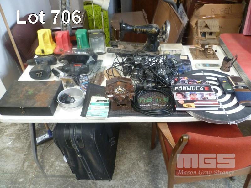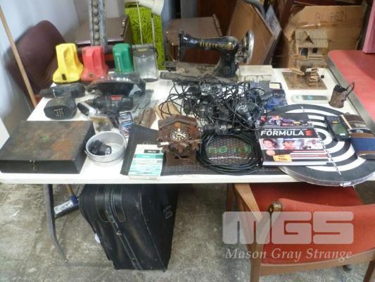 SINGER SEWING MACHINE, COOPERS BAR MAT, TORCHES, OUTDOOR LIGHTING, ETC, 1 x TABLE
