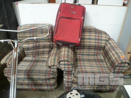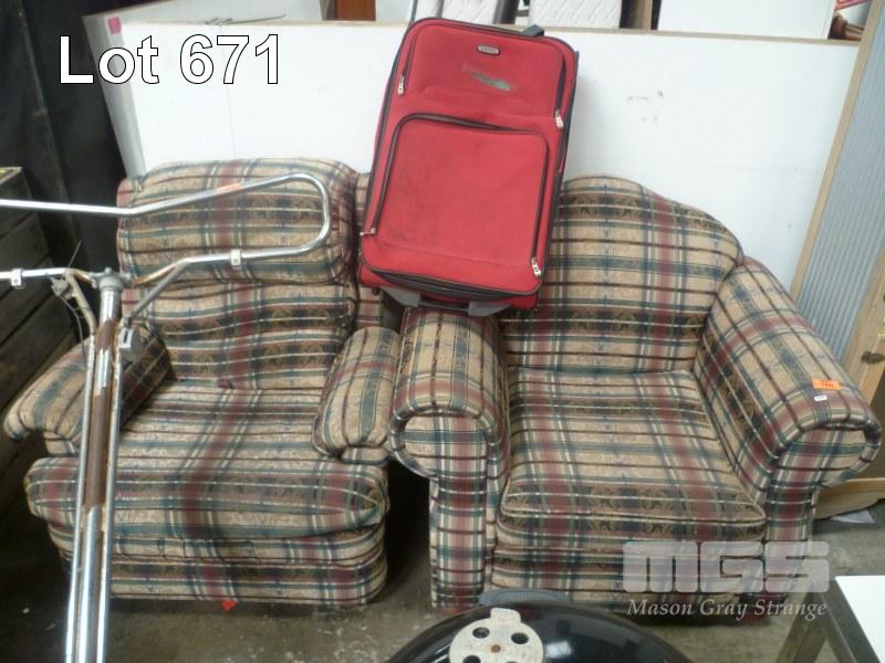 TARTAN FABRIC RECLINER & SINGLE SEAT LOUNGE CHAIR & 3 x STACKABLE GREEN PLASTIC CHAIRS