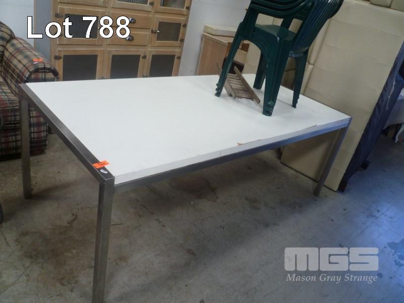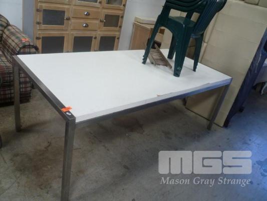 RECTANGULAR DINING TABLE, WHITE LAMINATE TOP, (DAMAGE TO EDGE), METAL FRAME