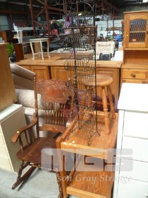 TIMBER ROCKING CHAIR, SMALL STOOL, MOBILE TROLLEY & CD TOWER