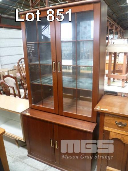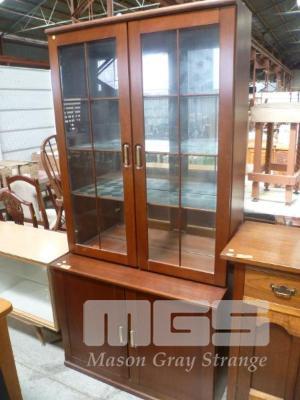 POLISHED TIMBER DISPLAY CABINET, 2 DOOR UNDERSTORAGE, MIRROR BACK, 3 x GLASS SHELVES