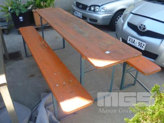 FOLDING TRESTLE TABLE, 2 x FOLDING MATCHING BENCH SEATS, PINE, 220cm (L) (1 BENCH WITH OLD SMALL TERMITE ROT)