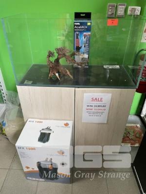 AQUARIUM, WATERBOX 3' TANK WITH CABINET (DISPLAY) ON CABINET WITH AQUAMANTA EFX 1500 FILTER, FLUVAL AQUAVAC & WATER CHANGER & DECORATIVE WOODEN FEATURE RRP $1499