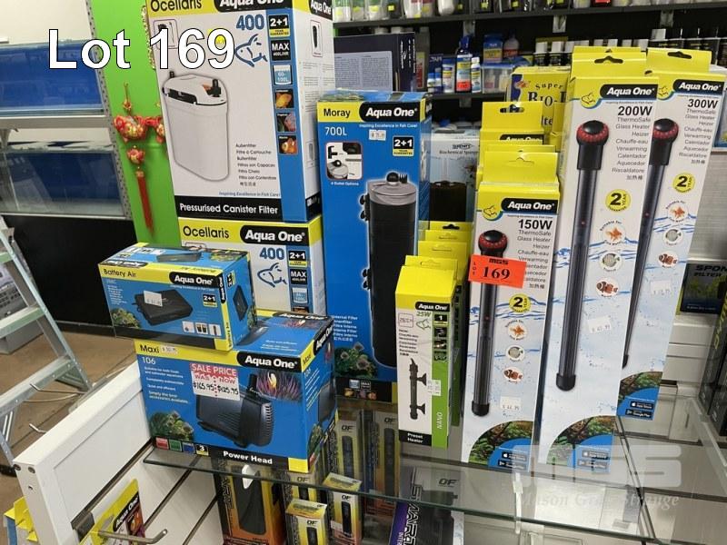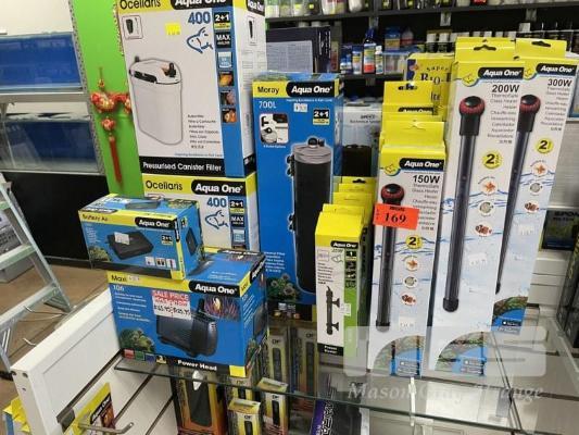 AQUA ONE ACCESSORIES, 12 x HEATERS, 300, 200, 150 & 25w & 3 x FILTERS, 1 x PUMP & 1 x AIR PUMP RRP $800