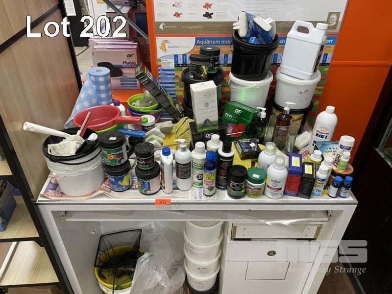 FEEDING BENCH & CONTENTS, PART USED AND OPEN CONTAINERS OF WATER TREATMENT, AQUA FEEDING, FISH HEALTH SUPPORT & NATURAL FISH MEDICINE, DYMAX, OCEAN NUTRITION, NEW ERA & OCEAN FREE