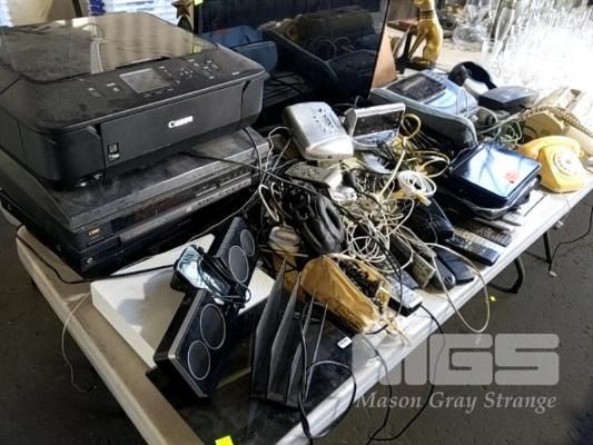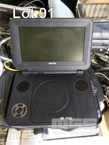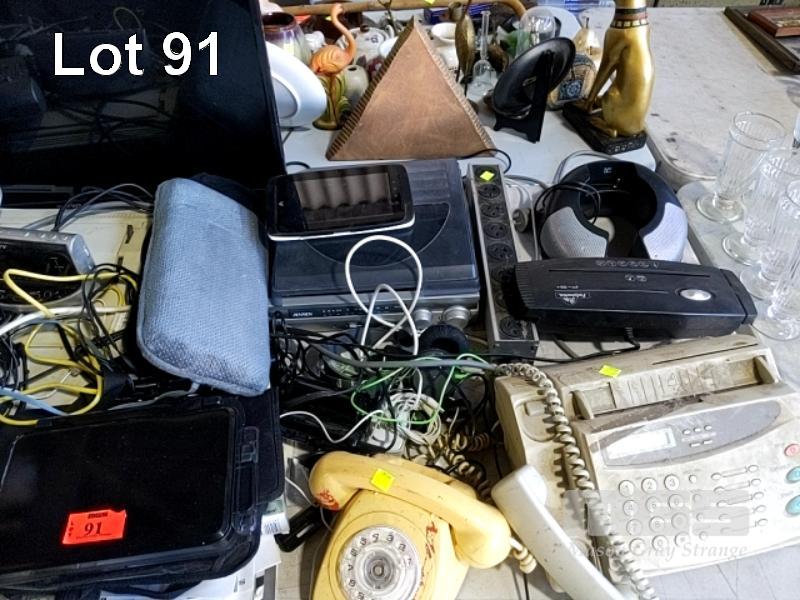 SONIQ 32" HD LED LCD TV, VCR, TURNTABLES, TELEPHONES, REMOTES, ETC, 1 x TABLE