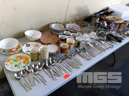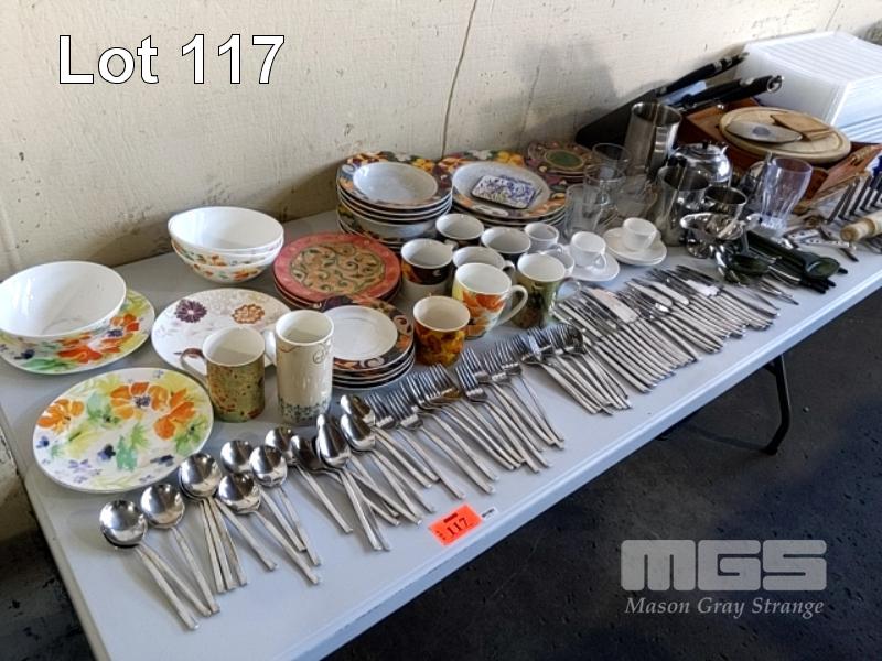 ASSORTED KITCHENWARE, CERAMIC PLATES, BOWLS, CUPS & CUTLERY