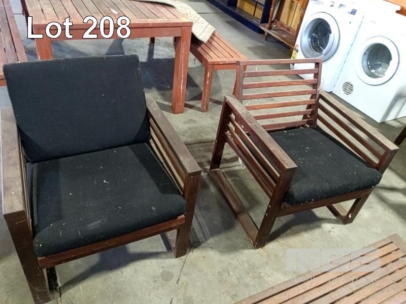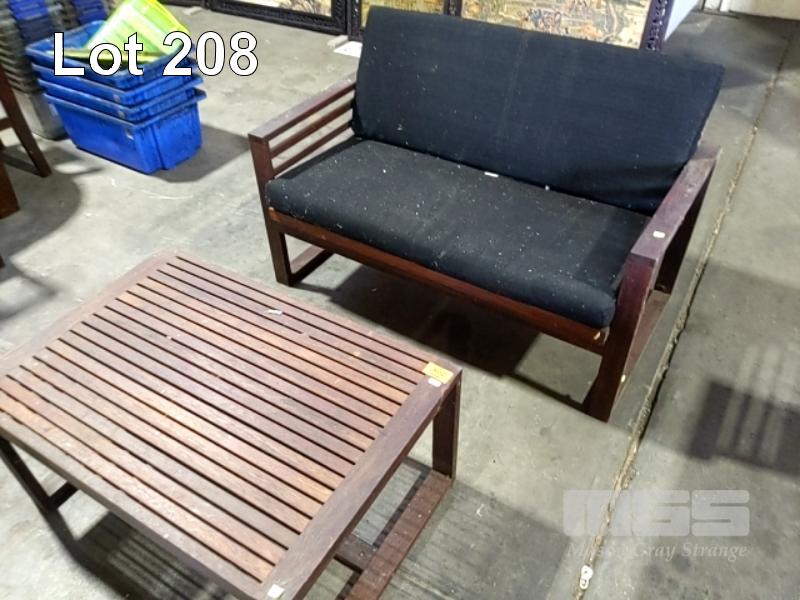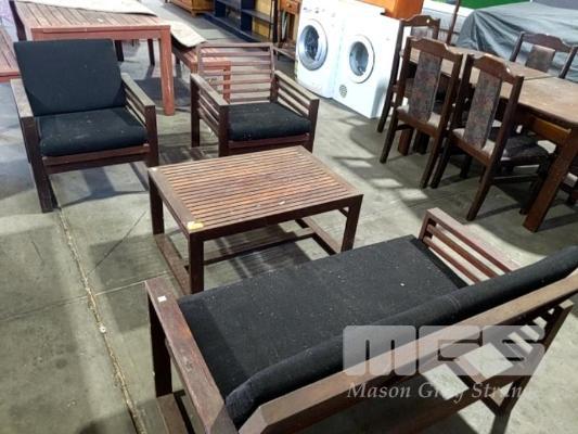 HARDWOOD OUTDOOR SETTING, SLAT TIMBER LOWLINE TABLE & 2 X ARMCHAIRS & BENCH SEAT