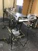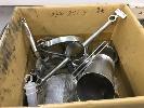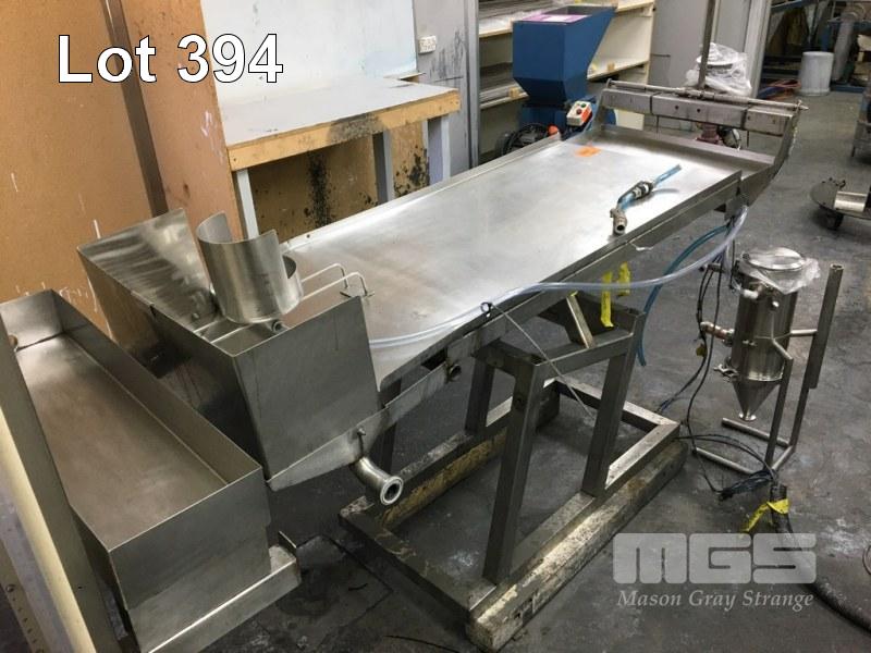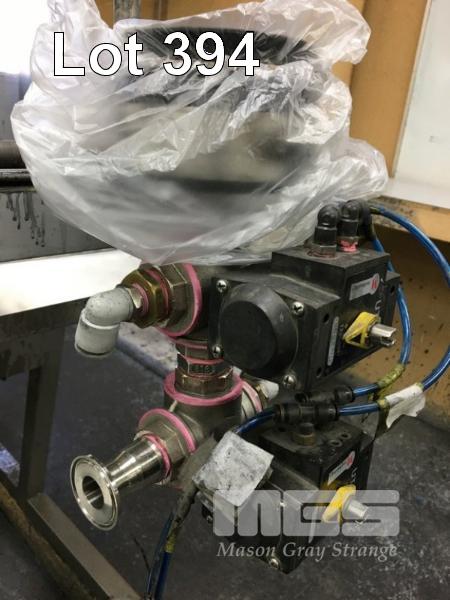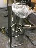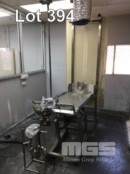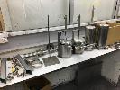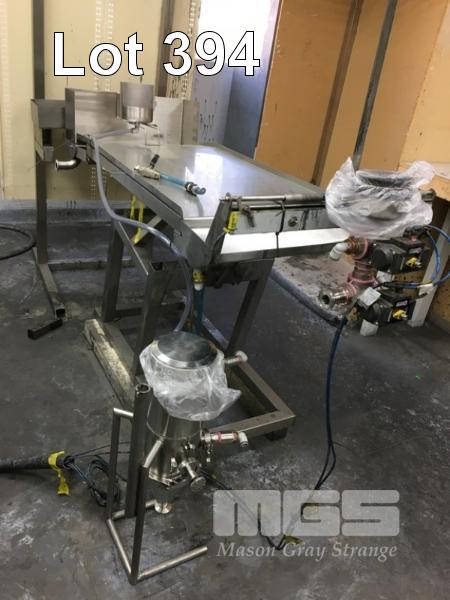 FABRICATED STAINLESS STEEL COATING STAND w DRAIN TRAY, 120psi INJECTORS, LARGE QUANTITY STAINLESS STEEL POTTS AND FITTINGS ON SIDE RACK