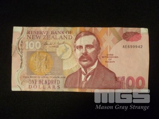 RESERVE BANK OF NEW ZEALAND, $100 PAPER BANKNOTE, AE 699942 (SIGNS OF REPAIR - TOP LEFT CORNER)