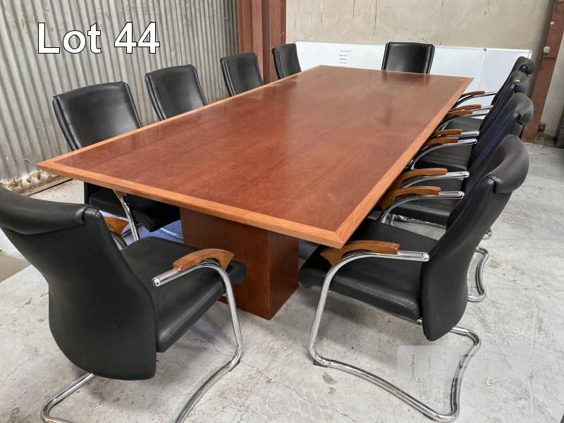 BOARDROOM TABLE, 305 X 142cm, POLISHED TIMBER VENEER, WITH 10 x MATCHING BOARDROOM CHAIRS, BLACK VINYL, CHROME